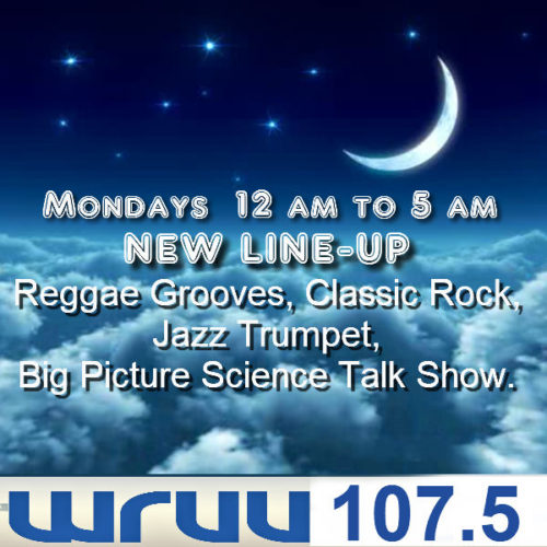 Mondays 12 – 5 am. NEW lineup – 12 am-Reggae, 2 am-Classic Rock, 3 am-Jazz -Trumpet Jazz, 4 am-Syndicated Science discussions with prominent scientists and researchers from a wide variety of fields; details below….01/28/2019