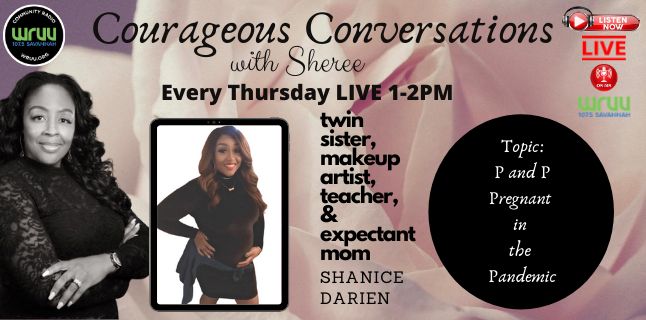 Thu. 1 pm – Courageous Conversations with Sheree welcomes back her twin daughter Shanice Darien, and shares the anticipation around the arrival of her rainbow baby. 07/30/2020.