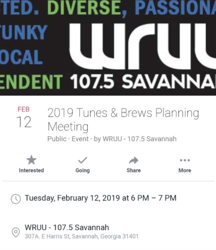 Savannah’s community radio station, WRUU-Lp-Savannah Soundings, would like to invite you to a “Tunes and Brews” party at Southbound BrewingCompany on April 27th from 6-10pm. Savannah Soundings has found its place online and at 107.5fm, and now it’s time to ensure we can bring you the community radio you love every day! All of the proceeds made from ticket sales and a portion of beer sales will go towards keeping WRUU on the air! 04/27/2019