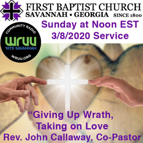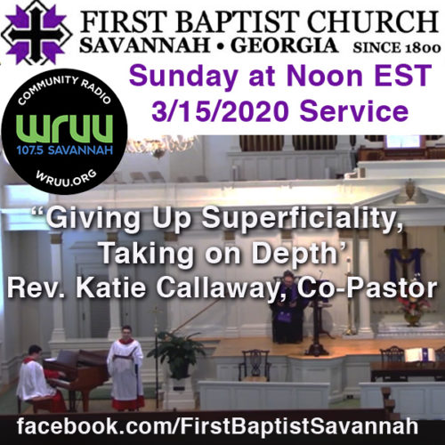 Sun. 12 pm – Sunday at Noon we invite you to listen to the March 8, 2020 service from the Inclusive First Baptist Church of Savannah. “We’ve allowed a shallow reading of one verse (John 3:16) to color the image of God. What if people simply read the next verse. John 3:17 ‘Indeed, God did not send the Son into the world to condemn the world, but……. 03/22/2020.