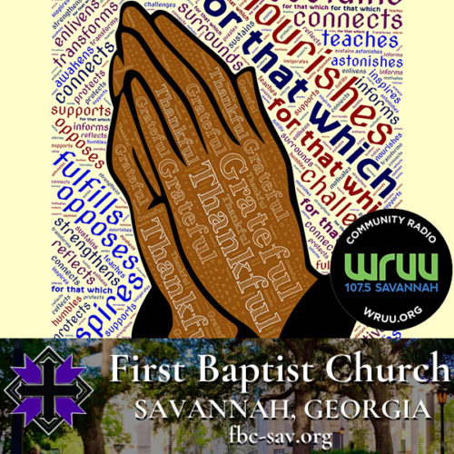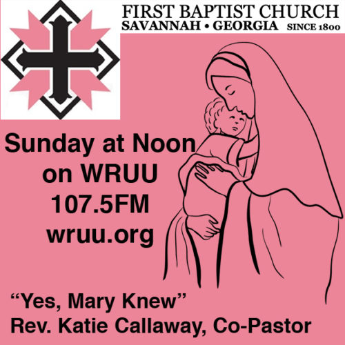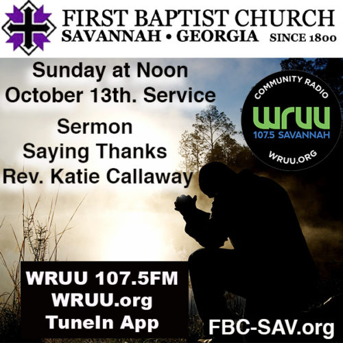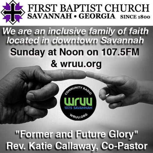 Join us at Noon on Sunday here on WRUU 107.5FM, for the November 10, 2019 worship service of First Baptist Church of Savannah. Our Co-Pastor Katie Callaway bring us the sermon “”Former and Future Glory.”t First Baptist Church of Savannah, ALL are Welcome. 12/01/2019.