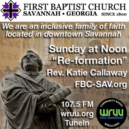 Sun. 12 pm EDT-Join the Inclusive First Baptist Church of Savannah, Sunday 11/17/19 at Noon on WRUU 107.5FM, globally at wruu.org and on TuneIn. This week’s service is from Sunday, October 27, 2019, which was Reformation Sunday. Rev. Katie Callaway preaches “Re-formation.” 11/17/2019.