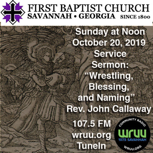 Join us at Noon on Sunday for the October 20, 2019 worship service of First Baptist Church of Savannah on WRUU 107.5FM, globally at wruu.org and on TuneIn. Our Co-Pastor John Callaway bring us the sermon Wrestling, Blessing, and Naming.11/03/2019.