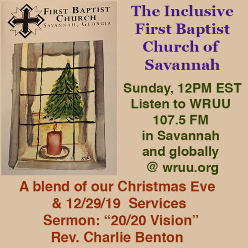 Sun. 12 pm – Listen to WRUU 107.5FM in Savannah and globally @ wruu.org for the weekly broadcast of The Inclusive First Baptist Church of Savannah. We bring you content this week from both our Christmas Eve and our 12/29/19 service. 01/12/2020.