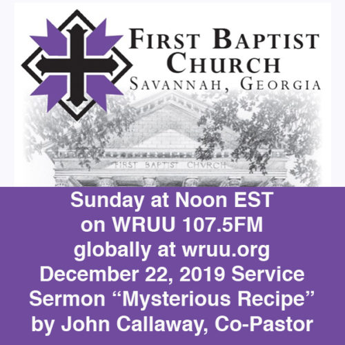 Sun. 12 pm – Join us on WRUU 107.5FM and globally at wruu.org at Noon EST on Sunday, January 5, 2020 for the December 22, 2019 service from the inclusive First Baptist Church of Savannah, GA. 01/05/2020.