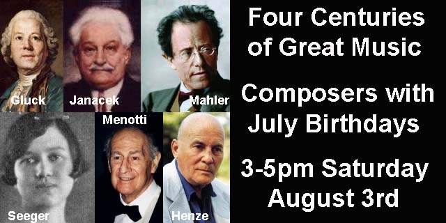 Sat. 3 pm. Celebrating Composers Born in July on “Four Centuries of Great Music” 08-03-2024