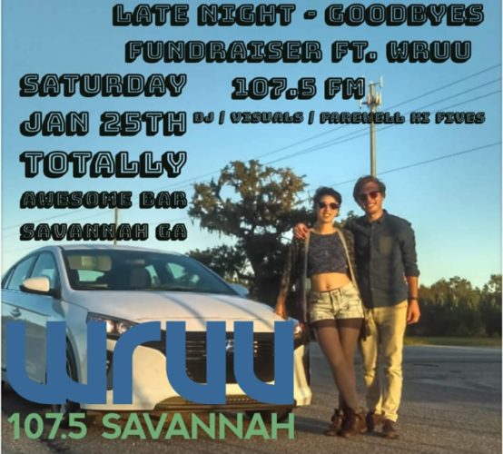 SAVE the DATE: Saturday, Jan. 25th, 9 pm. Late Night – Goodbyes & Fundraiser for WRUU – 107.5 FM Savannah and DJ’s Shane & Camille’s trip. *Dance, Drink and Support a good cause*. 01/25/2020.