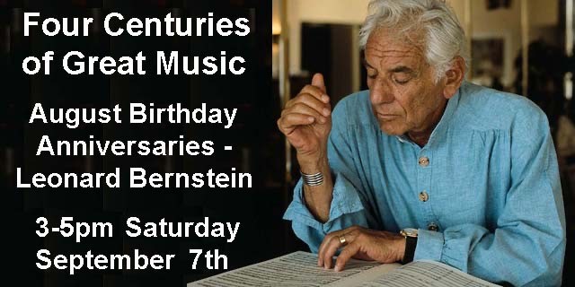 Sat. 3 pm. Celebrating the Birthday of Leonard Bernstein on “Four Centuries of Great Music” 09-07-2024