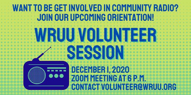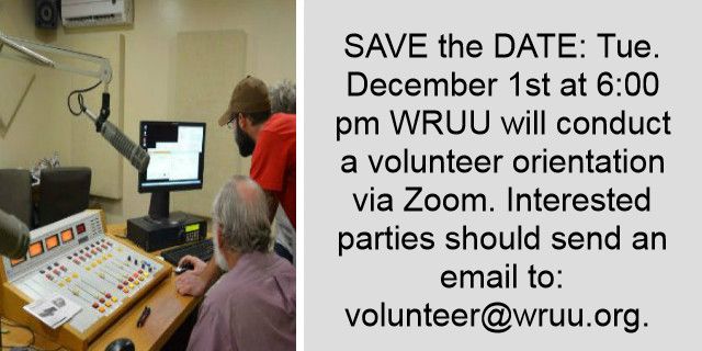 SAVE the DATE: Tue. December 1st at 6:00 pm WRUU will conduct a volunteer orientation via Zoom. Interested parties should send an email to: volunteer@wruu.org. 11/15/2020.