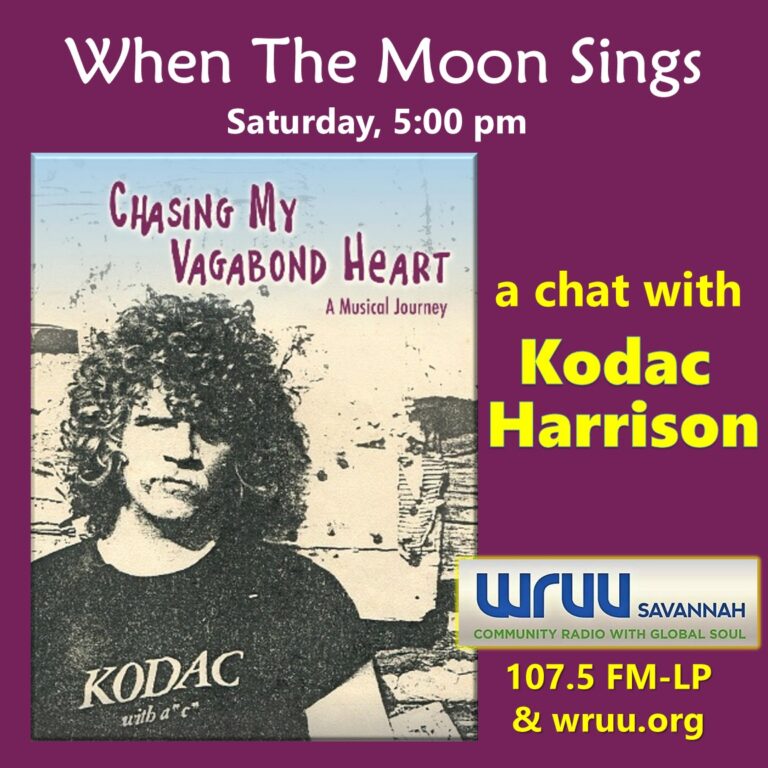 Saturday, June 7 on When the Moon Sings: Maybe Kodac Harrison is a modern troubadour – he has travelled widely, sung in everything from dives to formal events, and told his life stories through his own poems and lyrics. In “Chasing My Vagabond Heart,” Kodac writes down his works and tells the stories behind each — an autobiography partly in verse. This time, he discusses his book and the times behind it with P.T. Bridgeport. Tune in at 5 p.m.