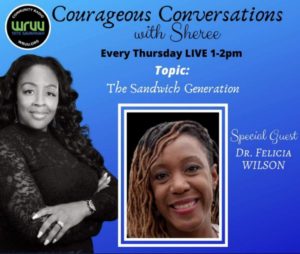 Thu. 1 pm – COURAGEOUS CONVERSATIONS Thursday @ 1 pm on Courageous Conversations with Sheree, Dr. Felicia Wilson brings tips for the Sandwich Generation. The generation who are charged with caring for their own children as well as their aging parents. Tune in if this currently describes your life! 01/09/2020.