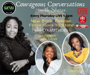Thu. 1 pm – Courageous Conversations with Sheree welcomes Co-Author’s Ayanna Gallow and Chidima Anusiem. In From Glass to Stone, 10 bestselling authors take you on a journey to show how life’s most difficult problems can be transformed into successful outcomes. They were all shattered and broken but now they are as solid as a rock. 02/13/2020.