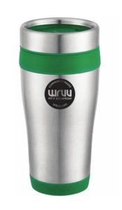 This is a 16 ounce hot or cold beverage container featuring double wall construction with a stainless steel twist-on lid, a slide lock drink opening and the WRUU logo. It’s perfect for taking hot coffee or tea – or iced water or other drinks – with you wherever you go. From car to office, home to school or gym to bedside, the WRUU travel tumbler will refresh your body as we refresh your mind.
